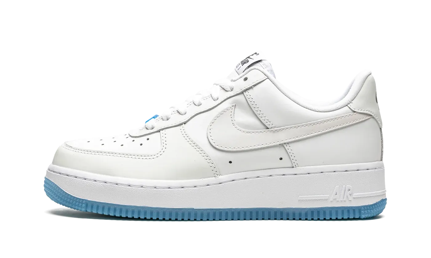 The Women's Nike Air Force 1 Low "UV Reactive" is a women's exclusive look for the retro basketball shoe that features photochromic inks that give the shoe a new multicolor look when exposed to UV light. It appears as a variation of the Air Force 1's "White on White" colorway when not in contact with UV rays. When exposed, the forefoot, eyelets, mid-panel, collar, and heel adjust into various shades of pastel colors. Specifically, the perforated toe and mid-panel turn yellow while the forefoot, eyelets, collar, and Swoosh transition from white to light blue, purple, and pink, respectively. A white midsole is paired with an icy translucent blue outsole. A Silicone Swoosh hang tag accompanies the shoe.