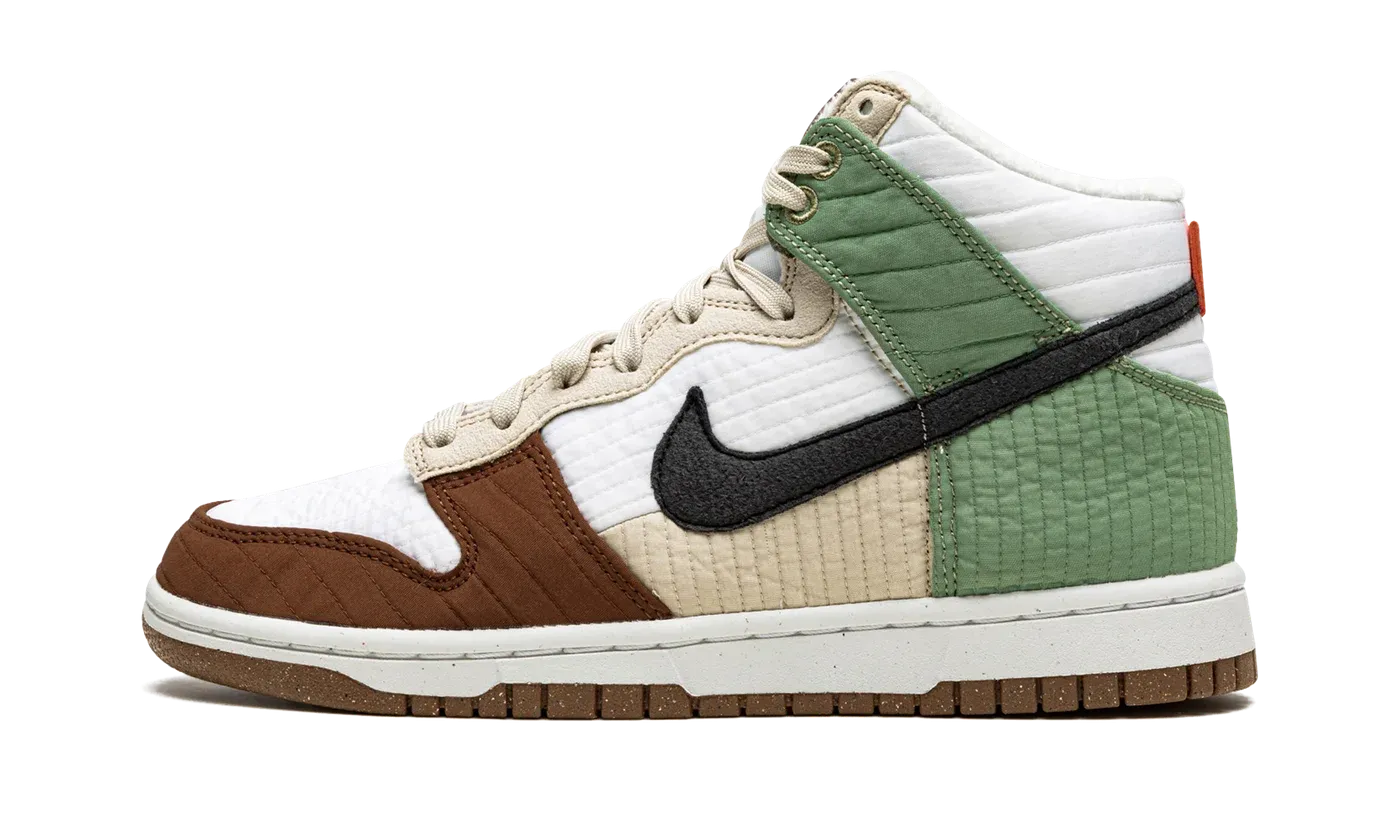 The Women's Nike Dunk High LX "Toasty" is a winter-ready colorway of the women's version of the retro basketball shoe that features a modified, eco-friendly construction. Designed to be worn in cold weather, the "Toasty," as its name implies, is complete with several design updates made specifically for winter. Constructed from 20% recycled content by weight, the shoe displays a quilted textile upper that mimics the look of winter outerwear. Mismatched panels in brown, green, and tan contrast the look of the white and tan base. A black synthetic leather Swoosh appears on both sides of the shoe. The pinwheel graphic printed on the brown tongue tag references the shoe's sustainable design. A fun-loving "Toasty" graphic appears on the insole as a nod to the warm fleece inner lining. Release date: November 3, 2021