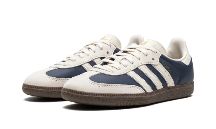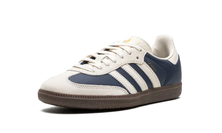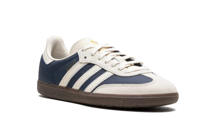 Reignite a street style legend with the Adidas Samba OG WMNS, a versatile take in the moody "Night Indigo Crew White" colorway. This women's-exclusive sneaker keeps the core heritage alive with a deep Night Indigo leather upper and contrast Cream White suede T-toe cap. Accented by bold serrated Three Stripes and Metallic Gold branding, this low-profile shoe is grounded by a durable, dark gum rubber outsole. It's the perfect statement piece that blends retro sport DNA with elevated casual cool.