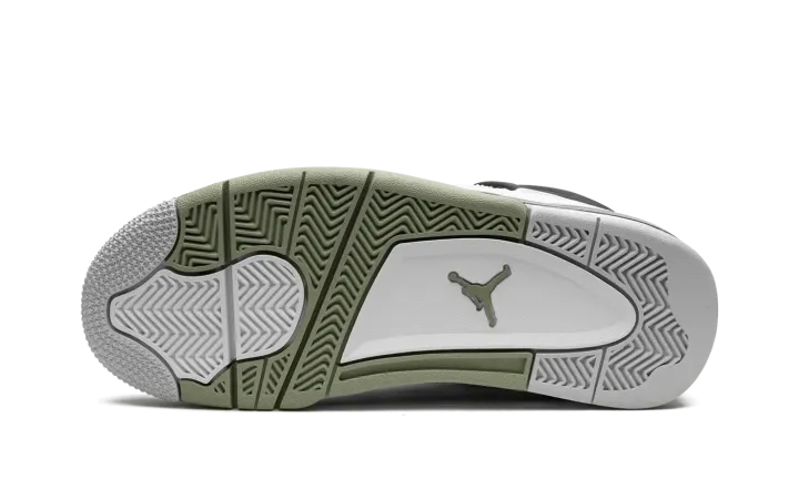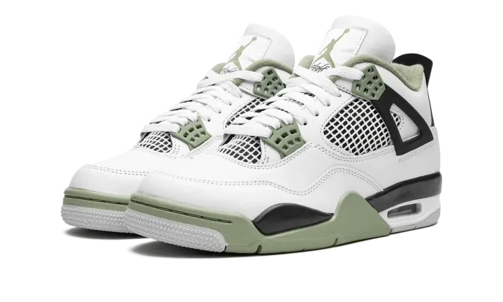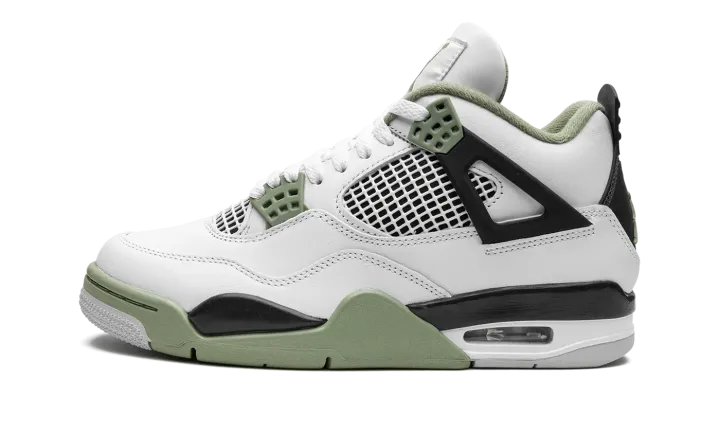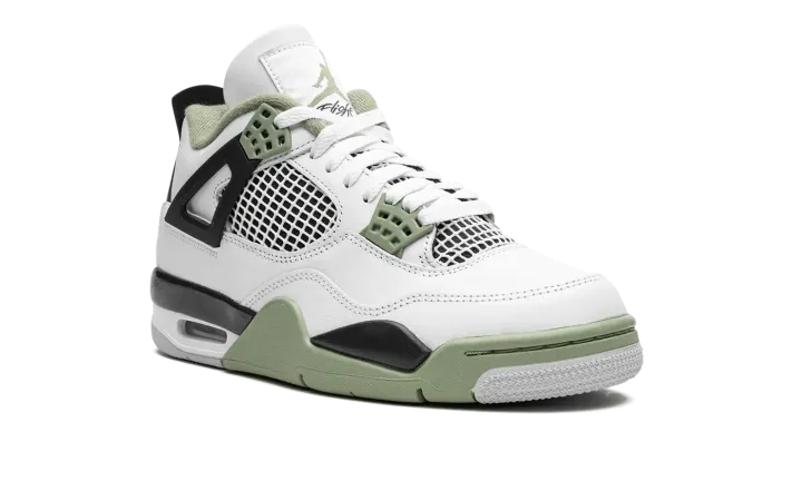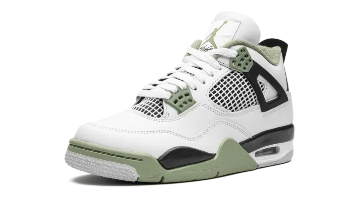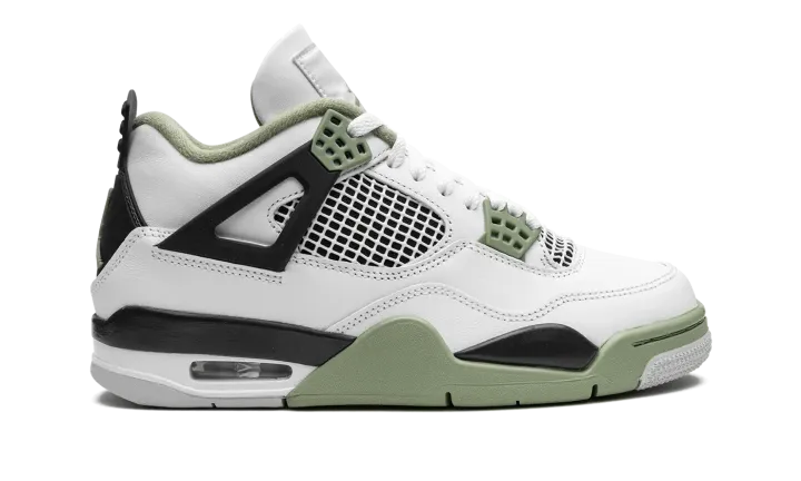 The Women's Air Jordan 4 "Oil Green" is a women's-exclusive colorway of the classic sneaker that adds to its impressive collection of releases. In the "Oil Green" colorway, this Jordan 4 is complete with a white leather construction with tonal netting on the tongue and mid-panel. Seafoam-colored eyelets are found on the sides of the shoe and additional Seafoam accenting appears on the Jumpman on the tongue and on the heel. The minty-green hue is also on the interior collar and on the rubber overlay on the toe and forefoot on the outsole. A visible Air bubble appears in the heel of the midsole. Release date: February 9, 2023