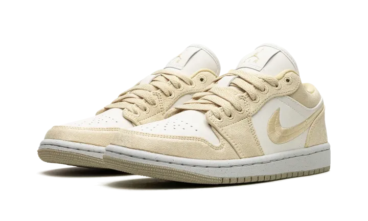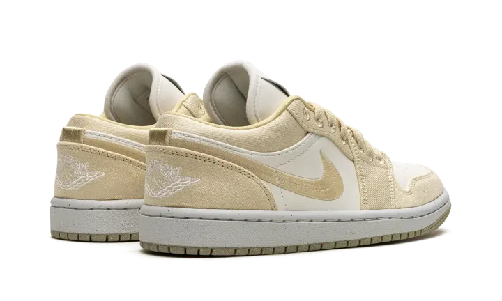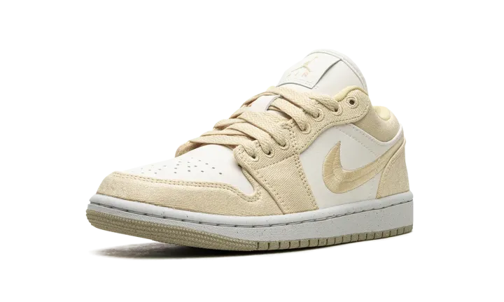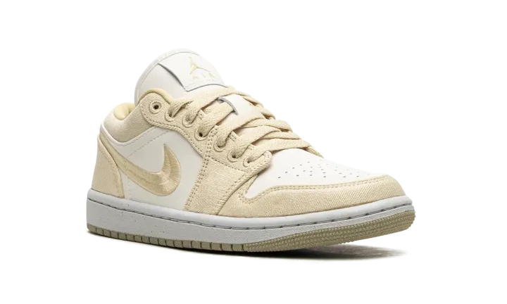 The Women's Air Jordan 1 Low SE "Team Gold" is a women's-exclusive colorway of the retro basketball shoe with a premium build featuring canvas. The colorway includes a white leather base with Team Gold canvas overlays and a Team Gold woven Swoosh. A white "Wings" logo is embroidered on the heel of the shoe. More Team Gold accenting includes Jumpman and "Air" logos on the tongue tag. A white rubber midsole and gold outsole complete the clean look.
