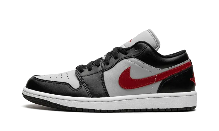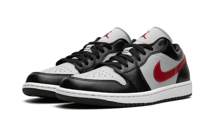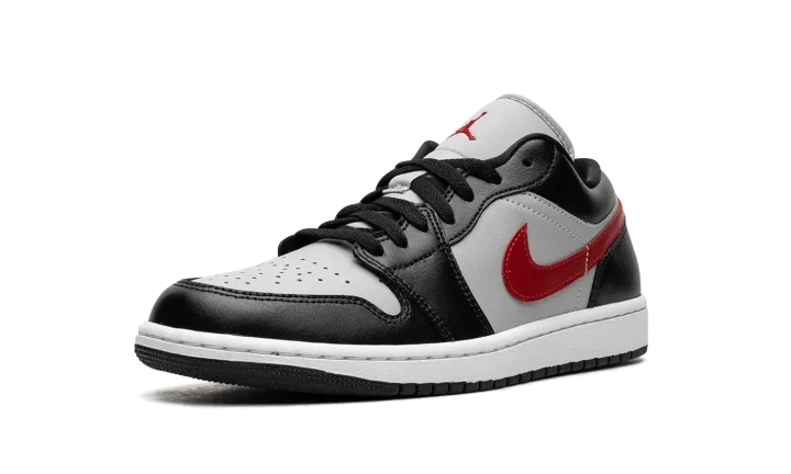 The Air Jordan 1 Low "Wolf Grey/Gym Red" is a colorway of Michael Jordan's first signature shoe in the alternate low-top silhouette with fiery red accents. The Jordan 1 Low is offered in a versatile color scheme on the "Wolf Grey/Gym Red" colorway. The upper features a Wolf Grey leather base with black leather overlays throughout the design. A Gym Red leather Swoosh is seen on each side of the shoe, adding a pop of color to the otherwise neutral upper. More red accenting is found on the "Wings" embroidery on the heel and on the Jumpman on the tongue. A white rubber midsole and black rubber outsole complete the look. Release date: September 29, 2023
