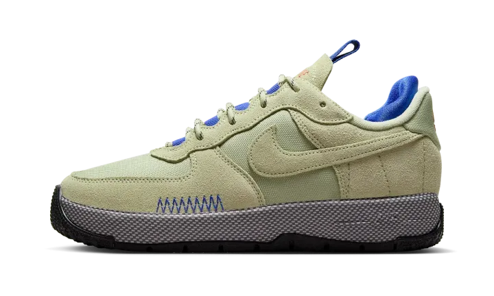 The Women's Nike Air Force 1 Low Wild "Olive Aura" is a women's-exclusive colorway of the modified version of the retro shoe with an outdoors-inspired design. The Air Force 1 Low Wild features rugged design elements inspired by outdoors performance footwear, including a textile-wrapped midsole and a durable canvas upper. Specifically, the shoe has an Olive Aura canvas base and tonal suede overlays. An Olive Aura suede Swoosh appears on either side of the shoe, while red "Nike Air" branding is embroidered on the heel and printed on the tongue. Olive Aura rope laces with blue speckling add to the shoe's durability.
