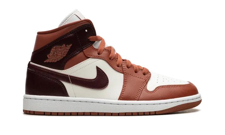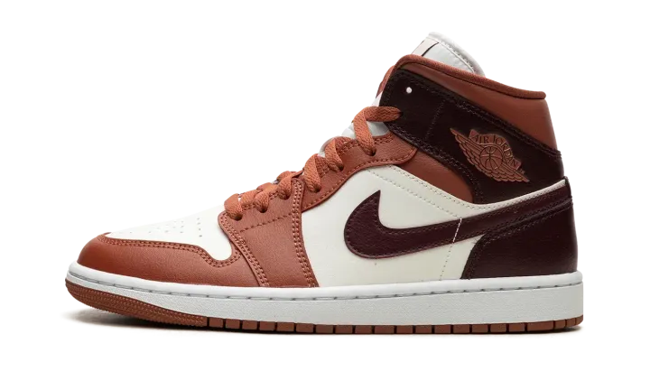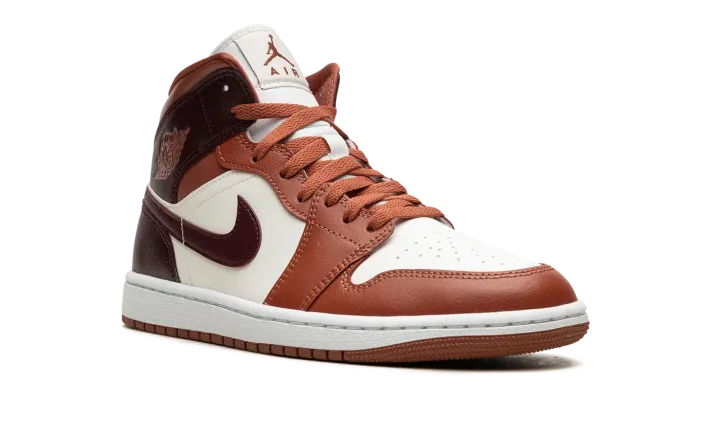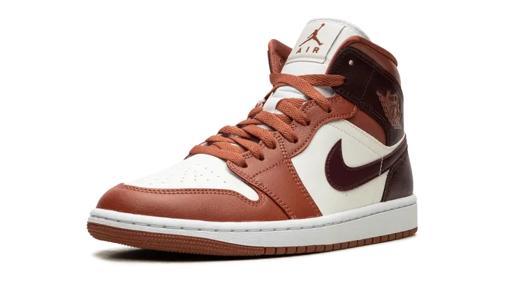 The Women's Air Jordan 1 Mid "Sky J Orange" is a women's-exclusive colorway of the lifestyle shoe with an eye-catching color scheme. The upper features a white leather base that is contrasted Sky J Orange leather overlays on the toe, forefoot, eyelets, and collar. A Bordeaux-like reddish-brown hue appears on the leather Swoosh, and on the collar and heel panels. "Wings" branding is found on the collar, while Jumpman branding appears on the tongue tag. A white rubber midsole and Sky J Orange rubber outsole round out the look. Release date: December 12, 2023