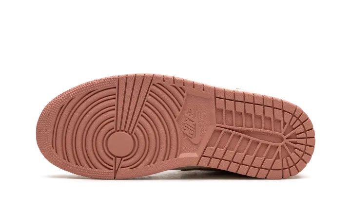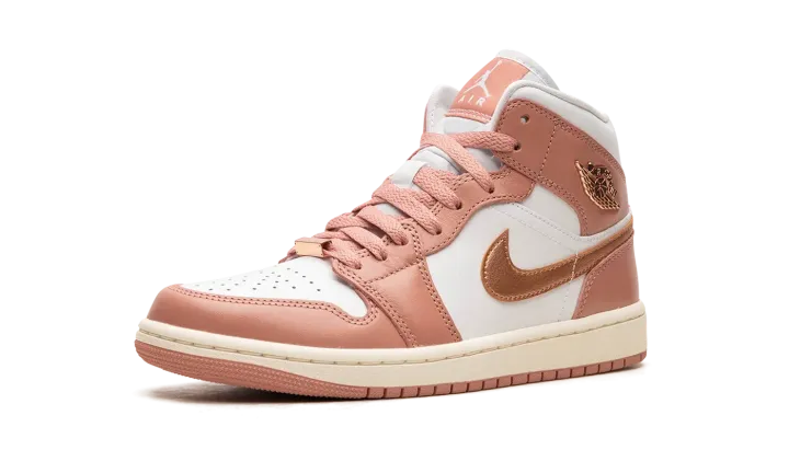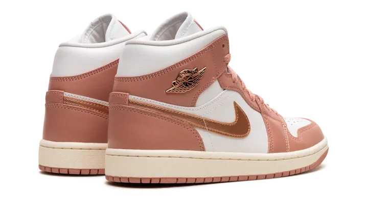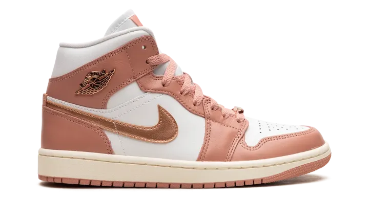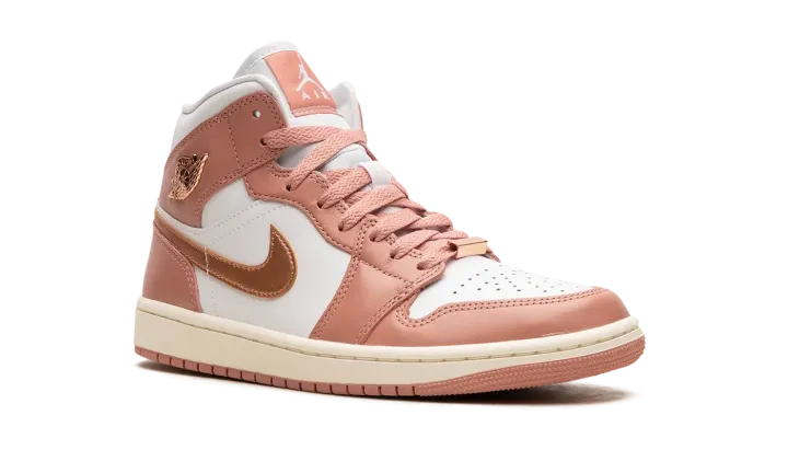 The Women's Air Jordan 1 Mid "Red Stardust" is a women's-exclusive colorway of the casual shoe with an opulent design. A premium look for the Jordan 1 Mid, the upper features a white leather base with Red Stardust-colored leather overlays. A metallic pink Swoosh appears on the sides while a metal "Wings" logo is seen on the collar. Jumpman detailing is found on the tongue tag. A metallic lace dubrae adds to the shoe's unique charm. Underfoot, an aged midsole completes the look. Release date: October 19, 2023