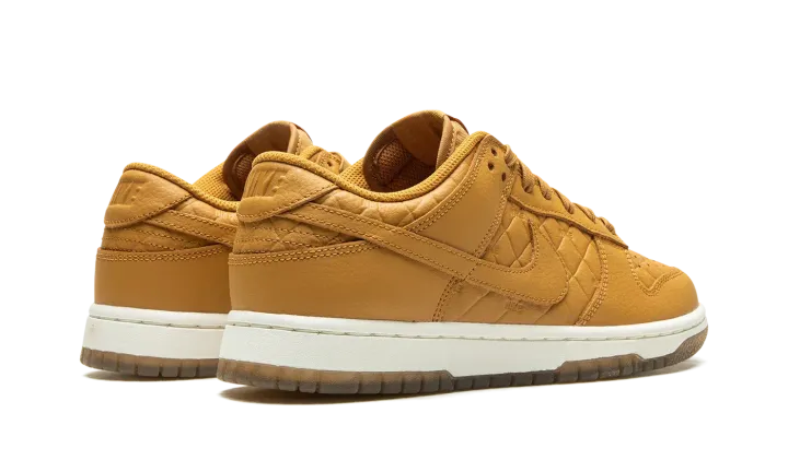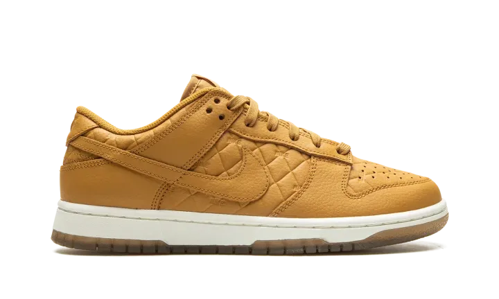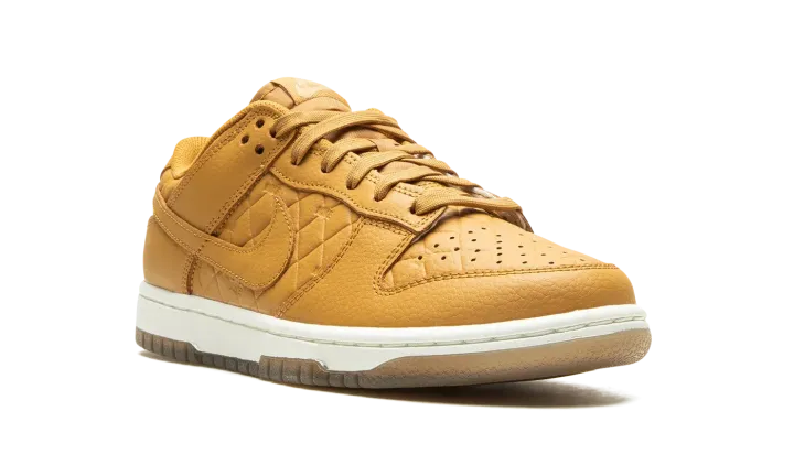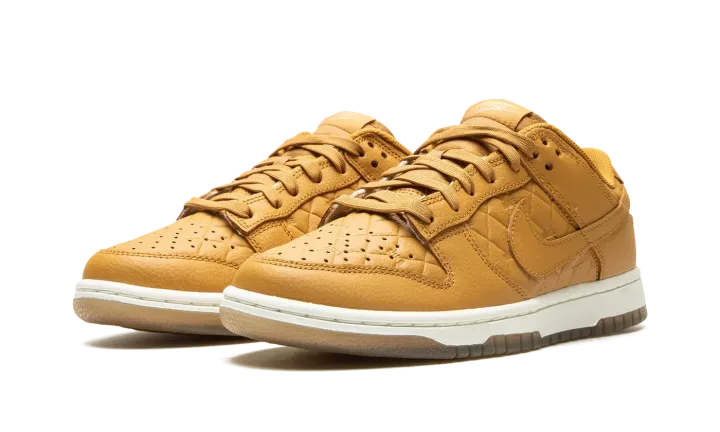 The Women's Nike Dunk Low "Quilted Wheat" is a women's-exclusive release of the retro basketball shoe in a fall-ready colorway. The "Quilted Wheat" puts an exciting remix on the beloved, autumn-inspired "Wheat" theme with faux quilted leather on the perforated toe, mid-panel, collar, and heel. Tonal Wheat-colored leather appears on the overlays and Swoosh branding. Debossed "Nike" branding is found on the heel, and signature "Nike" and Swoosh logos appear on the tongue tag. The shoe is complete with a white rubber midsole and translucent gum outsole. Release date: October 5, 2022